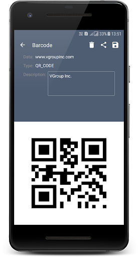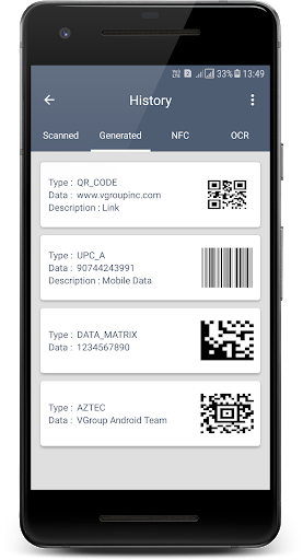 The scanned and generated barcodes can be shared as an image or in text format. The NFC and OCR data can be shared as text.